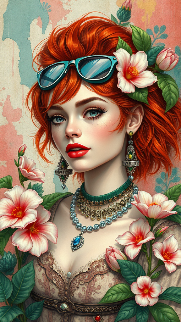 Portrait of a Victorian 80s punk woman with fiery red hair, adorned with a fusion of pastel hues, surrounded by lush greenery and vibrant blossoms, in the style of Tom Bagshaw. Her expression is a blend of rebellion and grace, with bold accessories complementing her vintage punk aesthetic. The background features an abstract interplay of colors, adding depth and contrast to the scene, while subtle design elements emphasize a sense of whimsical elegance.