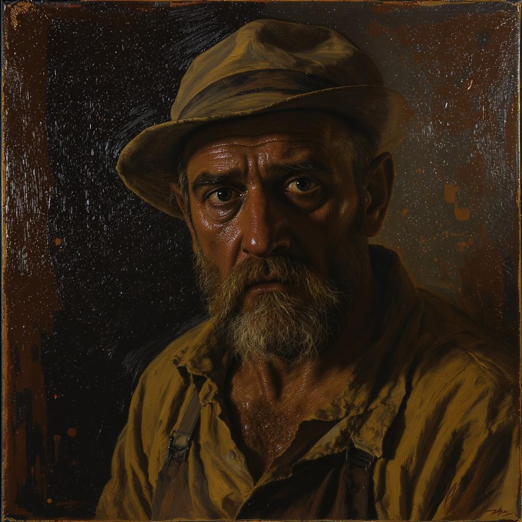 Portrait of a weary 19th-century laborer, male, with a fatigued expression, capturing the essence of the XIX century. The artwork features bold, heavy brushstrokes, layered with textured impasto paint, showcasing a high level of detail and intricacy. Bathed in cinematic lighting, the oil painting highlights the highly textured skin of the subject, evoking a dramatic atmosphere. Inspired by the styles of Vittorio Matteo Corcos, Albert Lynch, and Tom Roberts, the piece conveys a sense of depth and realism, rendered in stunning 8k resolution, evoking the classic appeal often trending on art platforms.