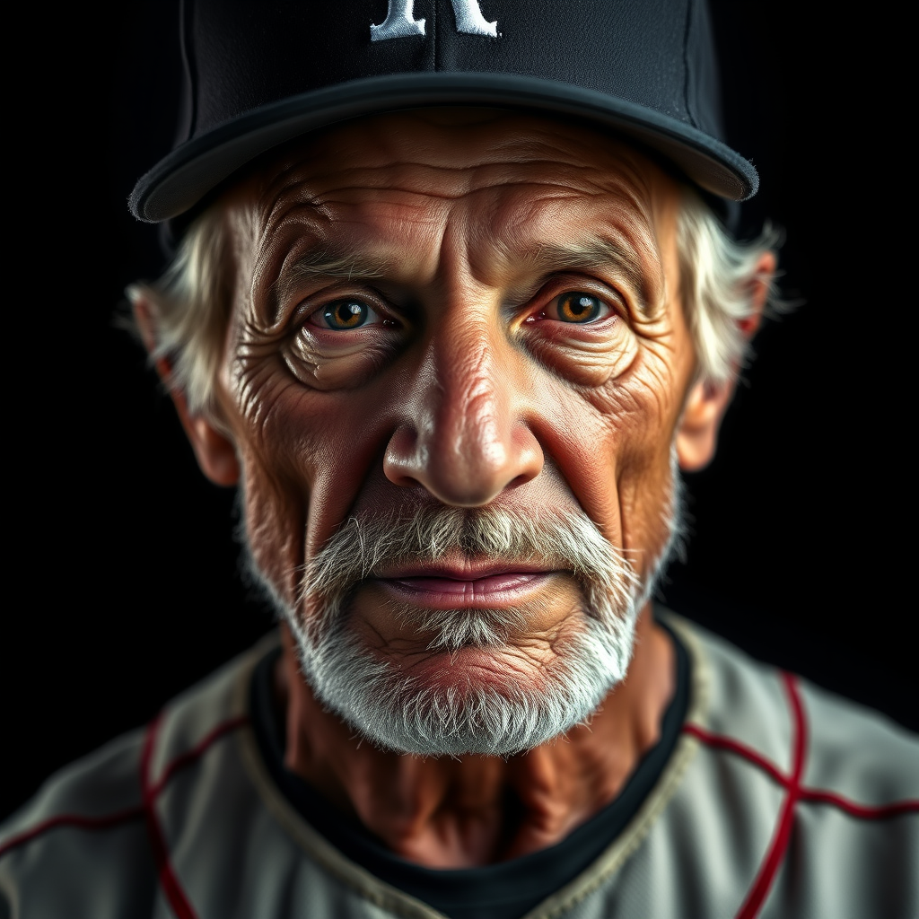 Portrait of a weathered veteran baseball player, studio-lit with precise 8k rendering, strikingly high-resolution and intricately detailed, set against a stark black background, capturing every nuance, professionally color graded, stock photo quality.