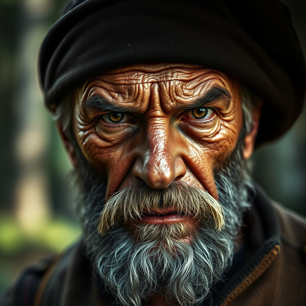 Portrait of a weathered woodsman, his intense gaze illuminated by a focused beam of light, highlighting the rugged lines etched by years of toil. The day’s effort visible in his furrowed brow and scruffy beard, the earthy tones of the forest subtly reflected in his worn clothing, imbue a sense of resilience and fortitude.