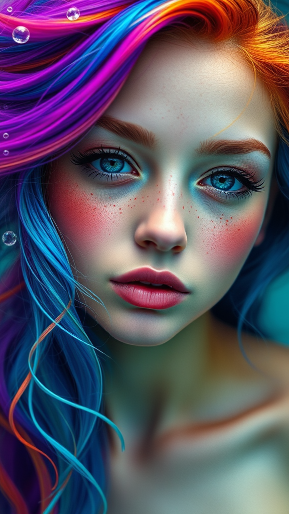 Portrait of a whimsical and colorful woman evoking the essence of a mermaid or siren. She has a fair complexion, youthful appearance, and wide, expressive eyes framed by delicate freckles across her nose and cheeks. Her vibrant hair cascades in luminous shades of violet, azure, fiery orange, and teal, seamlessly morphing into graceful tendrils or aquatic flora, enhancing the underwater illusion. Tiny bubbles drift around her head, accentuating the aquatic theme. Her attire or visible skin mimics the appearance of shimmering teal and emerald fish scales, laced with vibrant hues. The overall effect is that of a serene, otherworldly underwater being lost in peaceful contemplation.