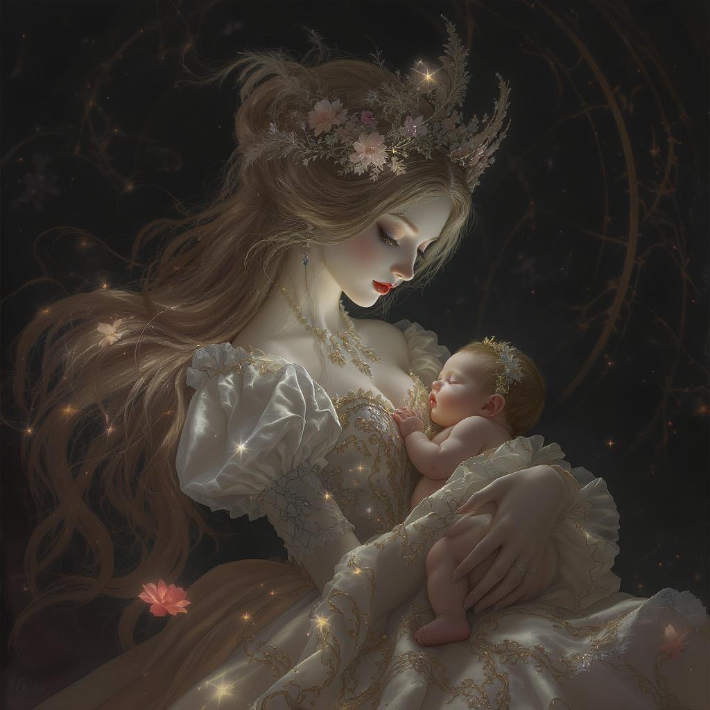Portrait of a whimsical magical girl, with a serene and ethereal presence, wearing an intricately detailed, ornate frilly dress. She is gently holding a cute baby, embodying a sense of wonder and fantasy. The artwork is a highly detailed digital painting featuring smooth, sharp focus, and glow effects, reminiscent of concept art by Artgerm, Greg Rutkowski, and Alphonse Mucha. The scene possesses a dark, atmospheric, yet vibrant cinematic quality, rendered in 8k using octane render and cinema 4d. The illustration evokes a model shoot style with hyperrealistic and vivid colors, featuring the artistic mastery of Ed Blinkey, Atey Ghailan, Jeremy Mann, and Greg Manchess. This imaginative piece, trending on ArtStation and CGSociety, combines photorealism with a dramatic touch, exuding high detail, sharp focus, and vibrant depth.