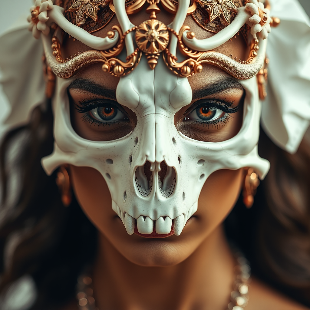 Portrait of a woman adorned with a skull and bone mask, rendered in rose gold and white hues, gazing directly at the camera. The composition embodies a vogue style with dreamy symbolism, blending celestialpunk influences with baroque-inspired details. Her tan skin is highlighted in a fashion editorial setting, using a Canon 50mm 1.2L lens to capture ultra-fine details. Her eyes convey intrigue, drawing viewers into a surreal fusion of elegance and otherworldly mystique, accentuated by ethereal lighting.