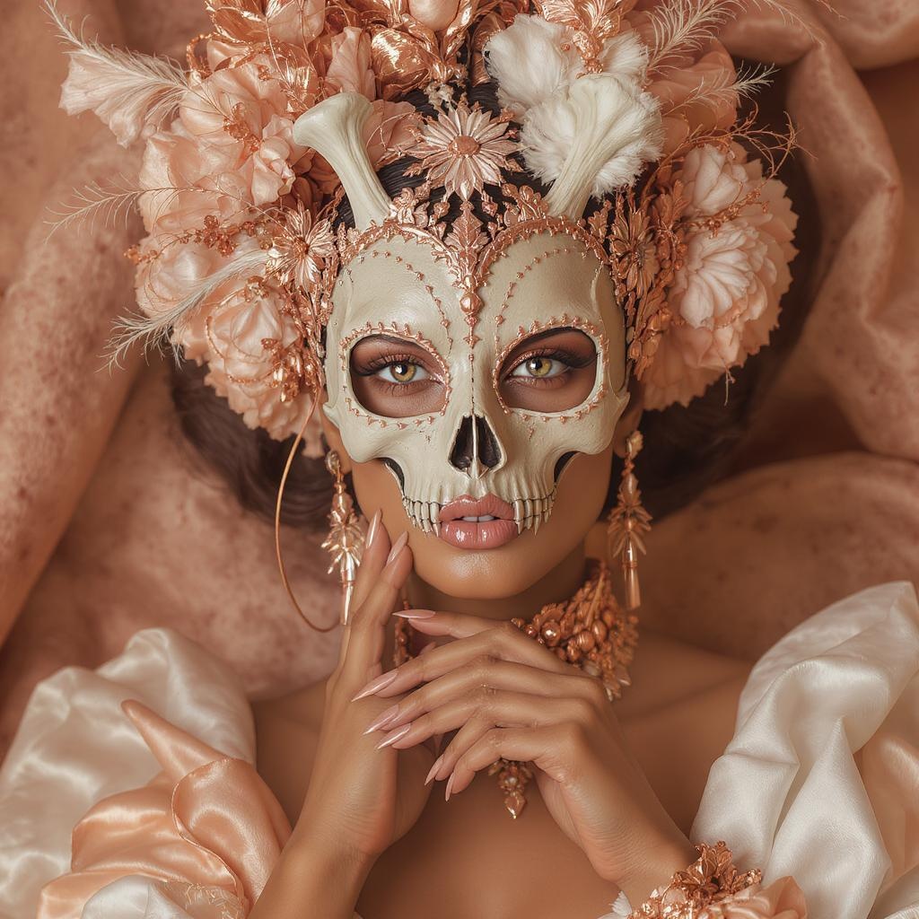 Portrait of a woman adorned with a skull and bone mask in rose gold and white hues, gazing into the camera with a vogue-inspired elegance, exuding dreamy symbolism and celestialpunk aesthetics. The composition is enriched with baroque-inspired details, showcasing her tan skin in a fashion editorial setting. Captured with a Canon 50mm lens at f/1.2, the image emphasizes ultra-fine details and exudes a raw yet stylized charm. The ambiance is ethereal and intricately detailed.