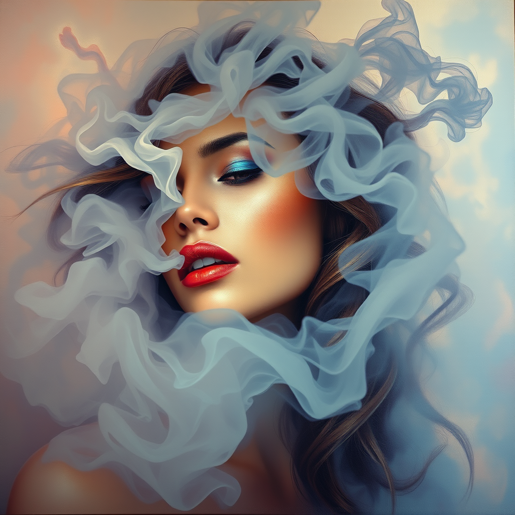 Portrait of a woman enveloped in a swirling cloud of smoke, with hints of a whirlwind effect, accented by cyan highlights and makeup, touches of pastel hues, shrouded in mist, exuding a seductive and sultry allure, breathtaking in composition. Rendered in an oil painting style with artistic flair, embodying modern aesthetic beauty in hyper-realistic detail.