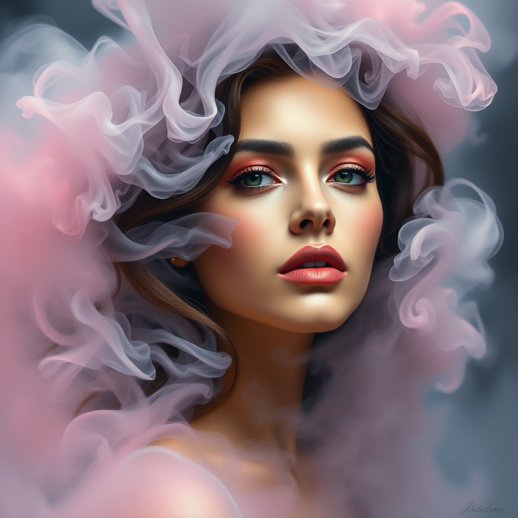 Portrait of a woman enveloped in a swirling cloud of smoke, accented with touches of whirlwind and soft pink highlights, her make-up harmonizing in shades of pink. A delicate hint of pastel hues weaves through the misty atmosphere, amplifying her seductive and sultry gaze. Captured in an oil painting style, the artwork exudes a breathtaking blend of artistic flair and modern aesthetic, achieving a mesmerizing hyper-realism.