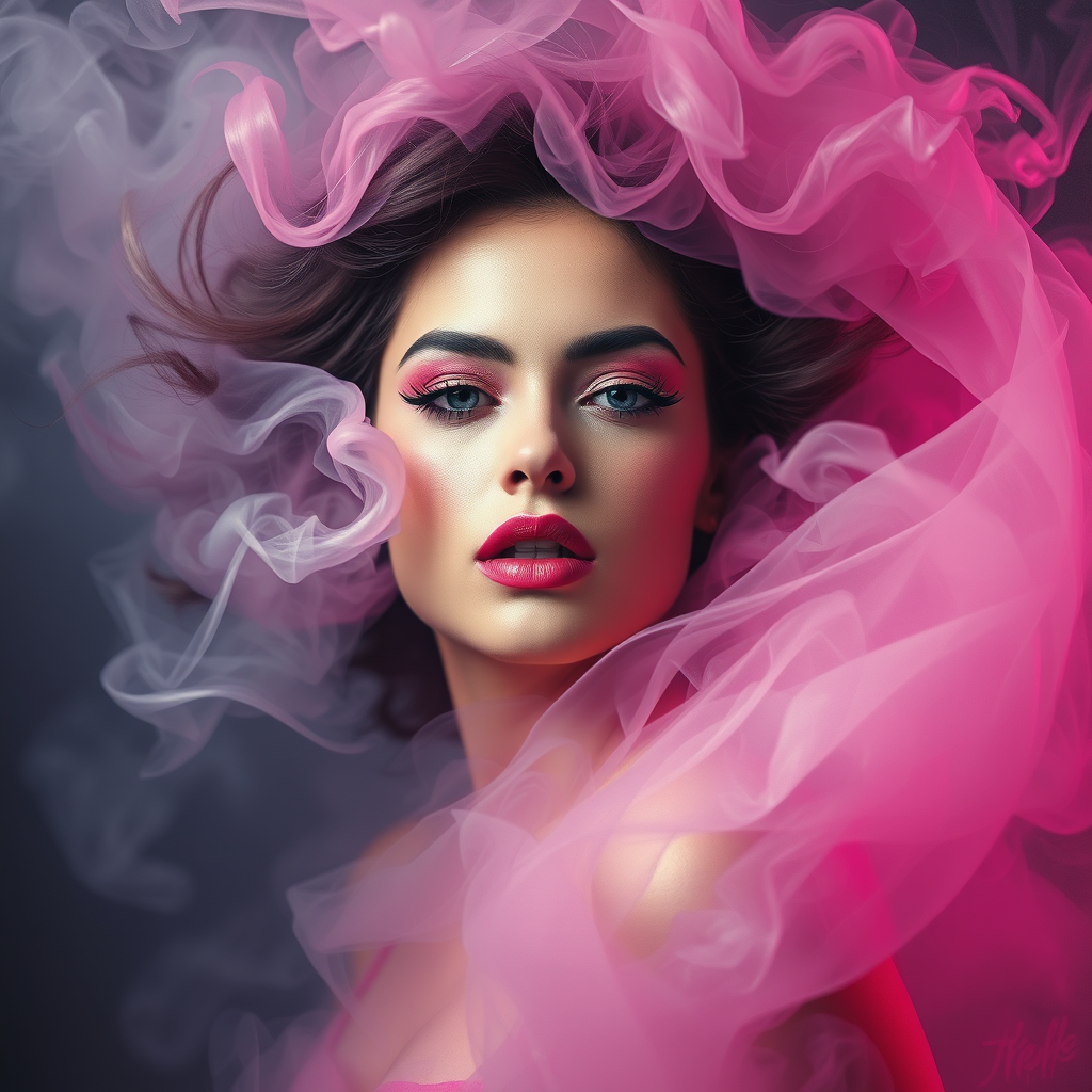 Portrait of a woman enveloped in a swirling cloud of smoke, dynamic whirlwind elements, accentuated with pink highlights, featuring pink-toned make-up and subtle pastel hints, enveloped in mist, exuding a seductive and sultry allure, breathtakingly captured in an oil painting style, artistic and modern aesthetic, hyper-realistic with a touch of ethereal beauty.