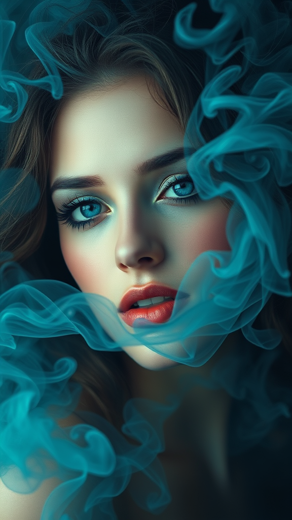 Portrait of a woman enveloped in a swirling cloud of smoke, highlighted with cyan hues, with captivating cyan make-up and subtle pastel tones, mysterious and enchanting, in a mesmerizing oil painting style, embodying modern artistic aesthetics with a blend of hyper-realism, exuding a sultry and breathtaking allure.