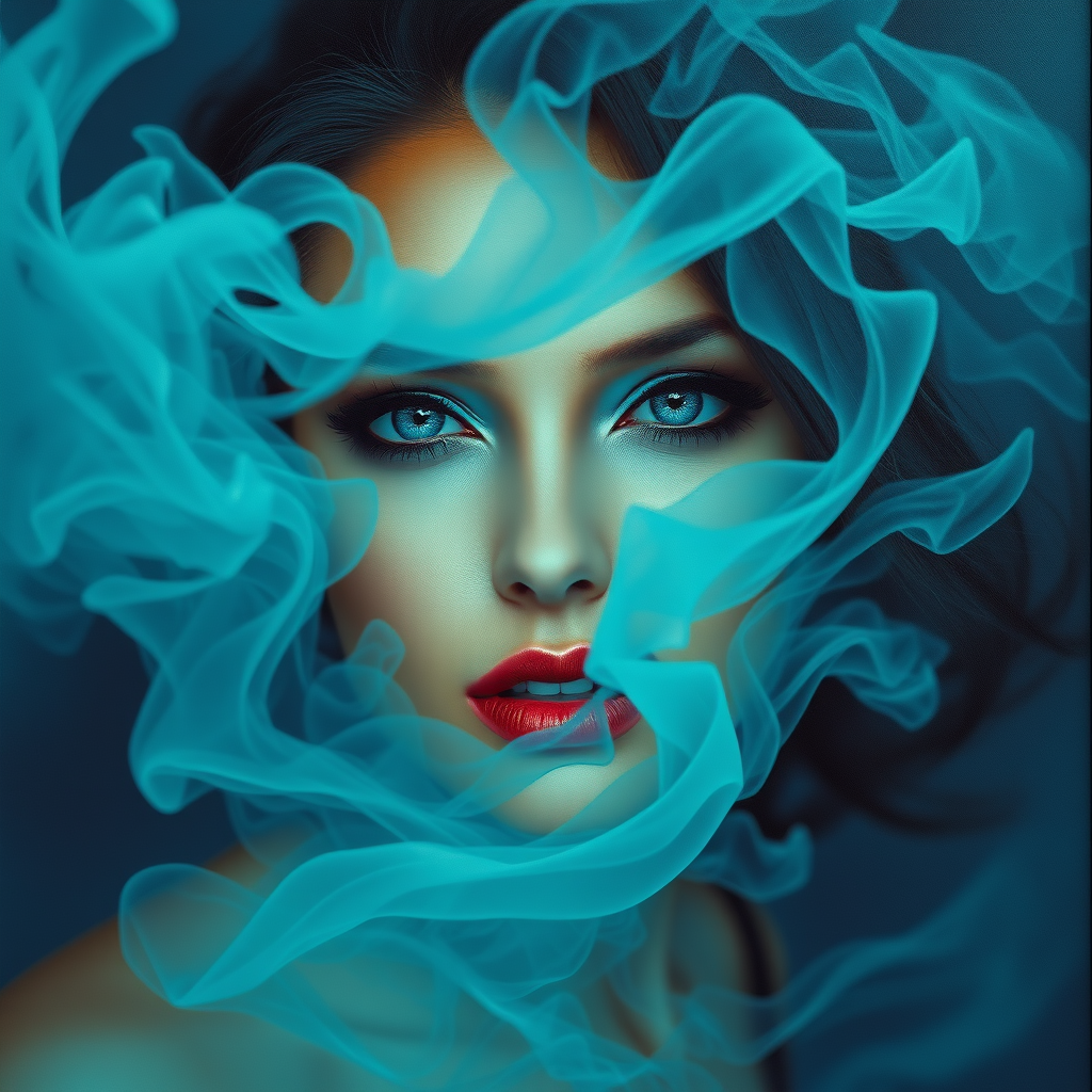 Portrait of a woman enveloped in a swirling cloud of ethereal smoke, with vibrant cyan highlights and striking cyan makeup, accented by subtle hints of pastel hues. The scene is misty and exudes a seductive, sultry allure, capturing a breathtaking essence. Rendered in an oil painting style, the artwork embodies a blend of modern aesthetic and artistic flair, achieving a mesmerizing level of hyper-realism.