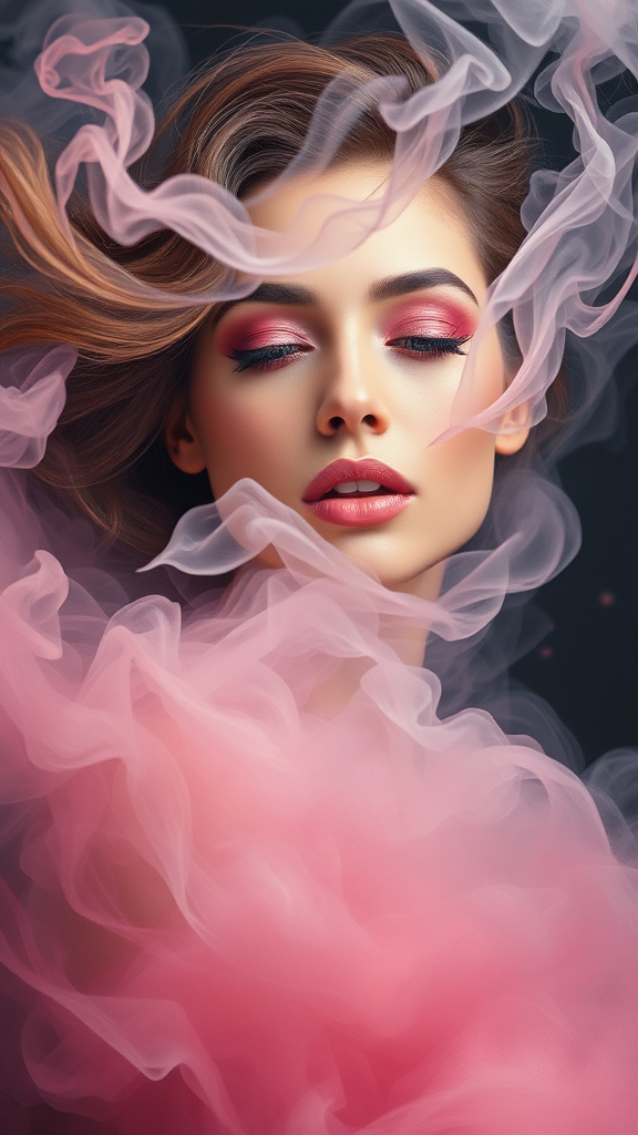 Portrait of a woman enveloped in a swirling embrace of smoke, infused with whirlwind energy, with ethereal pink highlights and makeup accented by whispers of pastel hues; a misty, captivating presence exuding seductive allure in an oil painting style blending artistic and aesthetic modern art with hyper-realism.