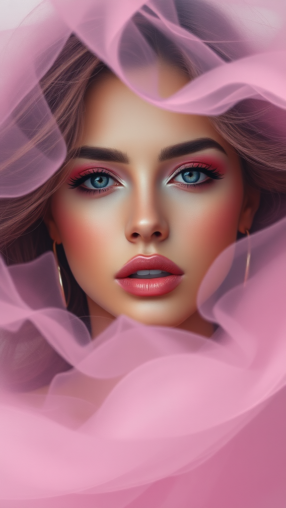 Portrait of a woman enveloped in a swirling haze, ethereal pink highlights accentuating her features, adorned with pastel-tinted makeup, surrounded by a misty ambiance, exuding a seductive and sultry allure, breathtaking in its hyper-realistic oil painting style, seamlessly blending modern art aesthetics with a hint of dreamy fantasy.