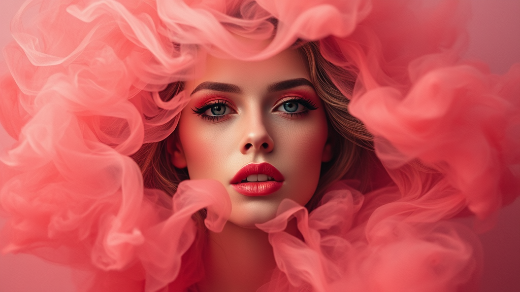 Portrait of a woman enveloped in a swirling mist of smoke, dynamic whirlwind of coral and pastel hues, accentuated with coral-toned makeup, evoking a misty, seductive, and sultry atmosphere. Her presence is captivating and breathtaking, rendered in a hyper-realistic oil painting style, merging artistic elements with the allure of modern aesthetic art.