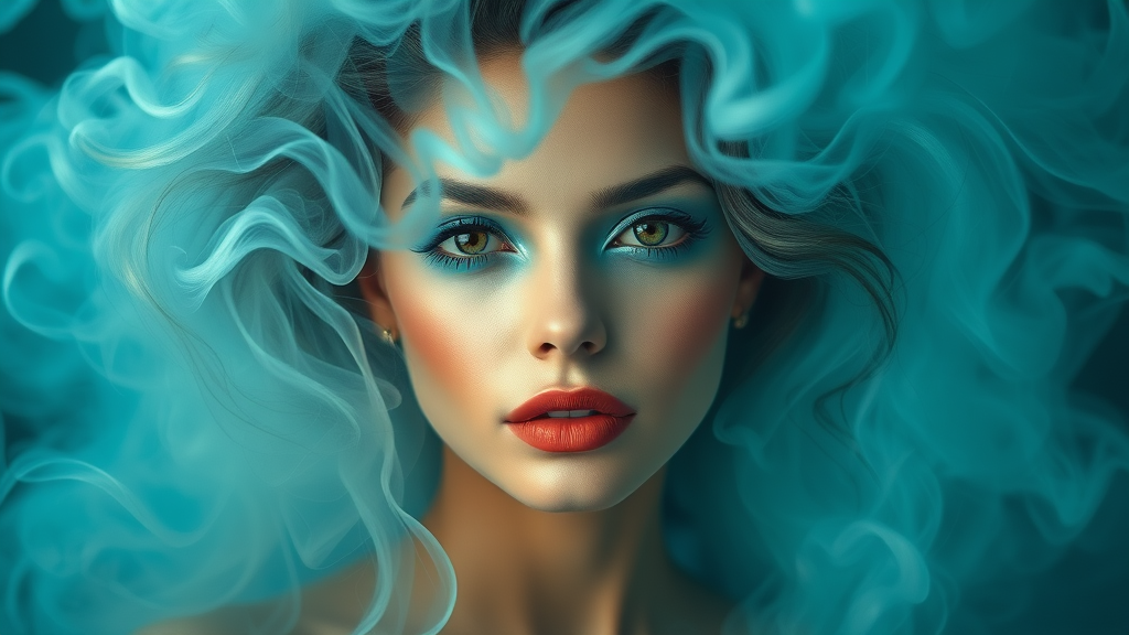 Portrait of a woman enveloped in an ethereal haze, swirling patterns of vapor, accented with cyan tones, striking cyan makeup, subtle touches of pastel hues, dreamy and alluring, exuding a sultry and captivating aura, in the style of a hyper-realistic oil painting, modern artistic aesthetic.