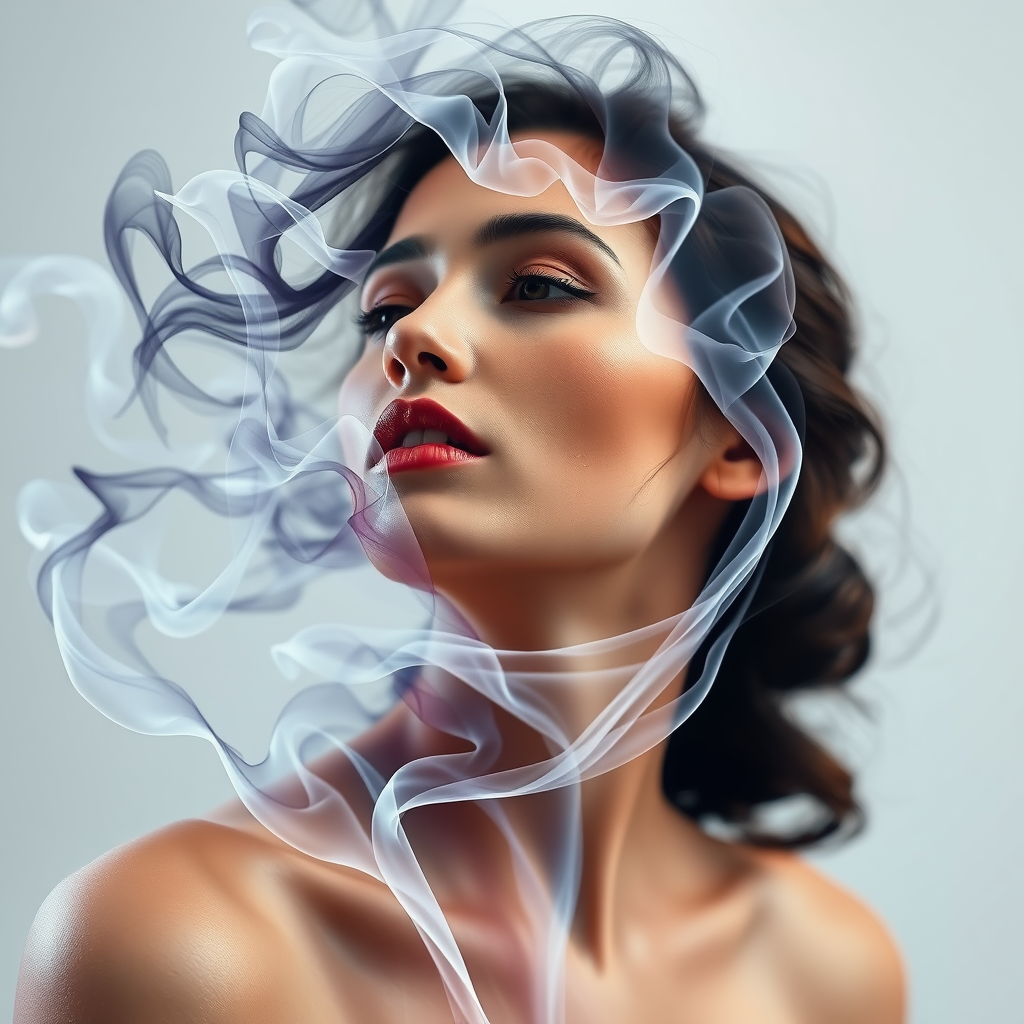 Portrait of a woman fashioned from wisps of smoke, reminiscent of graceful flowing fabrics and delicate ink washes, capturing the essence of dance and spontaneity. The image is inspired by the clear and crisp style of artists like Juliana Nan and Mandy Disher. The gentle motion and vibrancy of the smoke breathes life into the portrait, evoking a sense of fluidity and ephemeral beauty. The scene is infused with an artistic spontaneity that captures the dynamic interplay of light and shadow.