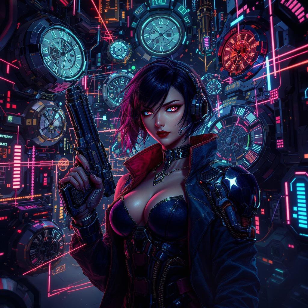 Portrait of a woman holding a futuristic firearm, surrounded by intricately detailed cyberpunk clocks and laser elements; set against a backdrop of neon lights and advanced technology. The composition is infused with science fiction vibes, reminiscent of Cyberpunk 2077, capturing a high-definition, vibrant anime style. The scene is painted in vivid chiaroscuro, with breathtaking cinematic detail and a highly polished CG look, emphasizing the character's presence amid the matrix of glowing timepieces and cybernetic elements. Despite the complexity, the artwork maintains clarity and avoids visual errors, presenting an impressive, captivating, and error-free image.