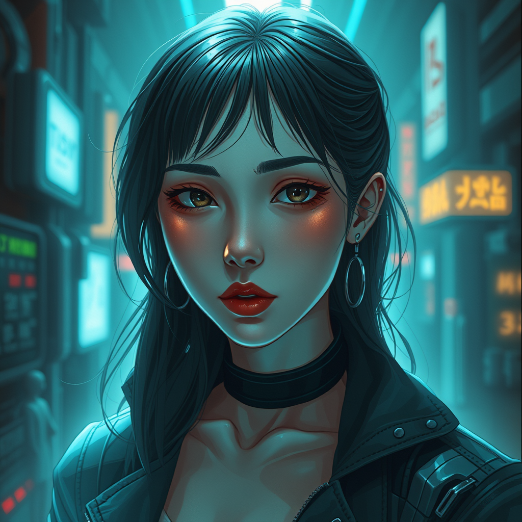 portrait of a woman in a cyberpunk setting, inspired by the styles of anime, Ghibli, and Akihiko Yoshida, enveloped in a synthwave atmosphere, with soft, ambient lighting highlighting finely detailed features in a sci-fi world. The artwork emphasizes perfect, highly detailed aesthetics, displaying elegant, captivating beauty. Despite imperfections like missing or extra digits, cropped or low-resolution elements, and occasional text errors, the portrayal maintains a sense of mystery and charm, avoiding typical errors of bad anatomy, deformed features, or poor drawing. The piece is intriguing even amidst potential distortions, subtly reminding the viewer of a beautifully flawed universe.