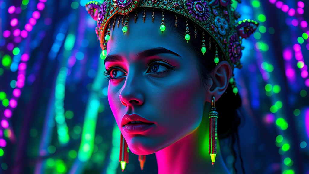 Portrait of a woman in a wide-angle shot, her eyes subtly positioned to one side of the frame, exuding a lucid dream-like aura as she gazes into the distance. Her skin and eyes possess a daydreampunk quality, glowing with an ethereal light. Adorned in an elaborately styled headdress, she emanates beauty, dripping in vibrant neon lights of striking blue, green, and purple hues, reminiscent of a bioluminescent fantasy. The vivid neon wonderland forest in the background enhances the scene's surrealism, filled with glowing particles in shades of blue, green, and purple. The composition employs the rule of thirds and golden ratio, with an asymmetric, hyper-maximalist layout, rendered in octane for photorealism and cinematic realism. This scene is enhanced using Unreal Engine, achieving a stunning 8k resolution.