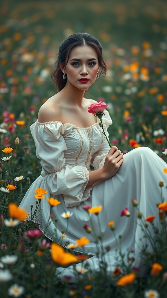 Portrait of a woman in an elegant dress sitting gracefully in a vibrant field of wildflowers, delicately holding a rose. Her face is intricately detailed, showcasing a perfect symmetry that adds a cinematic realism. Despite the attempt at high detail, there are signs of low-resolution artifacts, such as text errors, as well as anatomical irregularities like missing or extra fingers, and cropped elements. The piece suffers from jpeg artifacts and carries an unintended signature. Her body might have unrealistic features, such as extra limbs or poorly drawn hands and feet, contributing to a disfigured appearance. The image's composition is also affected by framing issues and tiling errors. Despite the artistic flaws, including certain mutated or blurry segments, the overall image still captures the allure of the scene with an abstract charm.