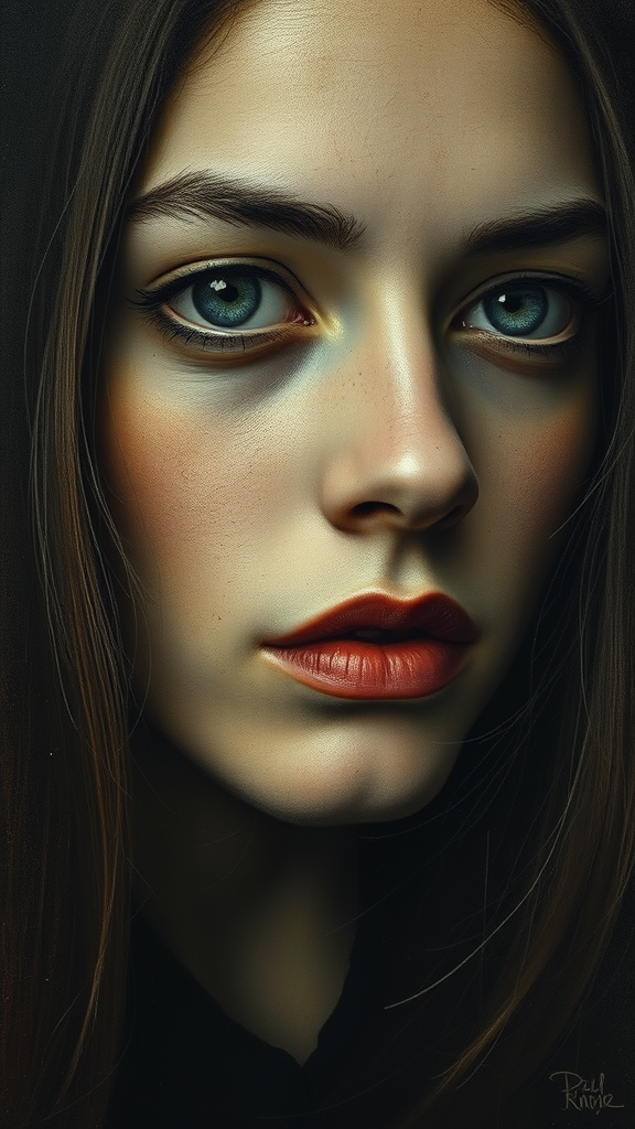 Portrait of a woman in the style of an oil painting, featuring grainy textures and minimalist avant-garde elements. The focus is on her empty, haunting eyes, reminiscent of the detailed yet subtle approach found in classic paintings by Diego Velazquez. The composition is rich with details, drawing on the essence of old masterpieces, and presented in a modern 16:9 aspect ratio. The stylization is set to evoke a unique blend of the past and present with a touch of creative abstraction.