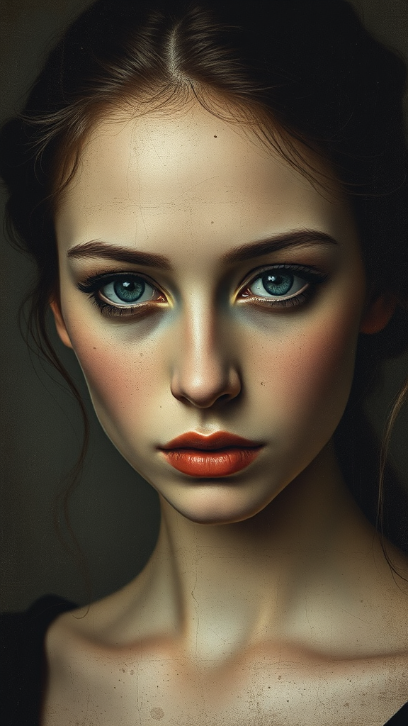 Portrait of a woman in the style of an oil painting, showcasing grainy textures and an enigmatic expression with empty eyes. Inspired by minimalist avant-garde elements, it features intricate details reminiscent of old masterpieces by Diego Velazquez. The composition is richly detailed yet maintains a sense of simplicity, capturing the timeless elegance of classic portraiture with a modern twist.