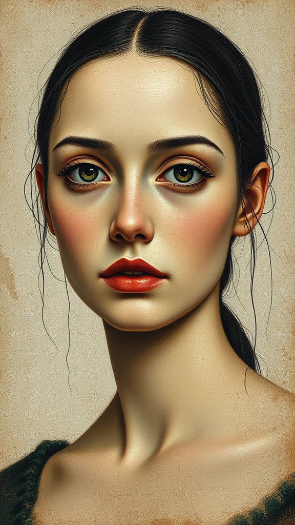Portrait of a woman, inspired by Diego Velazquez, featuring an oil painting style with grainy textures. Her eyes are depicted as empty voids, evoking a minimalist avant-garde aesthetic. The artwork contains intricate details set against a simplified backdrop, blending the old master techniques with a modern twist. Using a 16:9 aspect ratio, the piece maintains a high level of stylization, capturing the essence of both traditional and contemporary art forms.