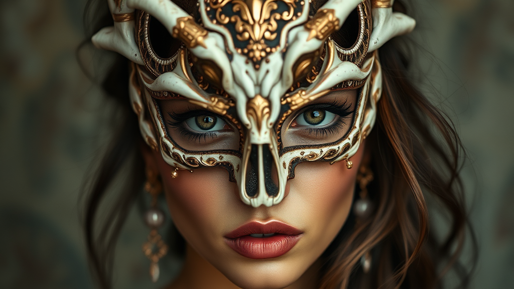 Portrait of a woman wearing an intricate skull and bone mask with rose gold and white accents, gazing directly at the camera in a vogue style. The composition features dreamy symbolism and celestialpunk themes, complemented by baroque-inspired details. Her tan skin contrasts elegantly with the mask and her expression conveys ethereal allure. Set in a fashion editorial context with ultra-fine details, captured using a Canon 50mm f/1.2 lens, infused with a raw aesthetic and a stylize factor of 50 version 6 style.