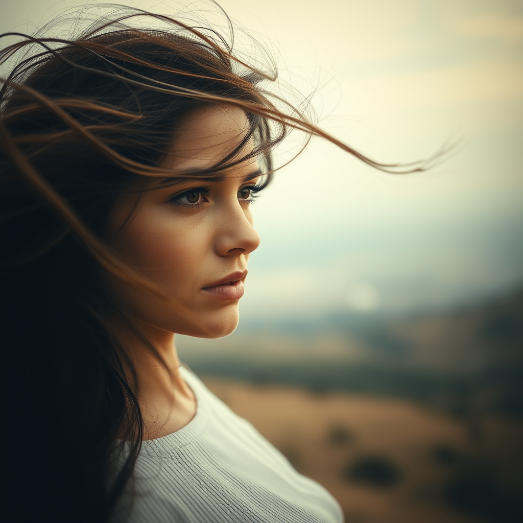 portrait of a woman with natural lighting, her hair dancing in the wind, capturing the essence of freedom and strength, a serene landscape unfolds in the background, soft focus adding a nostalgic touch, colors muted with a hint of warmth.