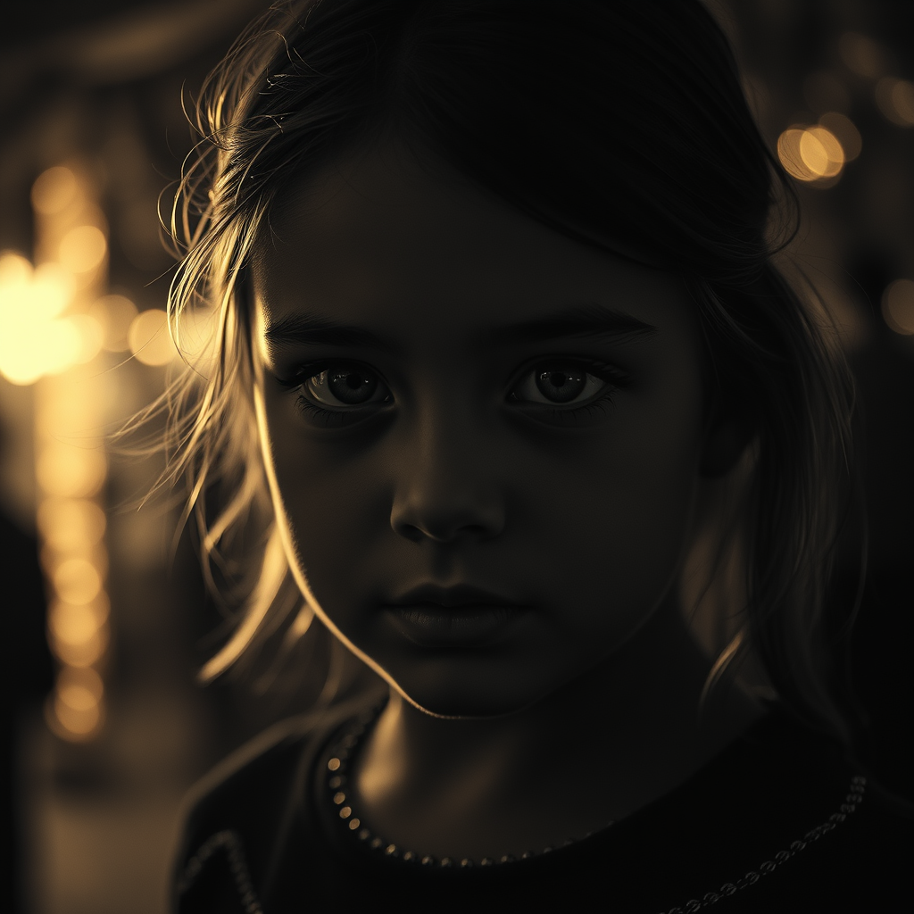 Portrait of a young girl in black and white, exuding a dark and brooding atmosphere, capturing hyper-realistic details in a carnivalesque setting. The image is shot with a Hasselblad 500c/m, illuminated by a subtle golden light that adds a mysterious glow. The ultra-high-definition quality gives it a lifelike presence, akin to a Sony Alpha a1 capture. The ratio and essence remain consistent, offering a slightly surreal yet captivating visual experience.