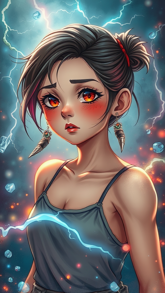 Portrait of a young girl with magical elements of lightning, fire, ice, water, and wind surrounding her in a dreamlike and mysterious nocturnal scene. The setting is awash with glowing colors and iridescent, opalescent wires floating around, along with delicate earrings. Her face shows traces of dirt and imperfections, emphasizing her natural beauty and humanity. She stands in a voluminous play of light, her red eyes reflecting her innate power. The artwork is a blend of illustration and painting that combines elements of anime and a cartoonish style, capturing her muscular build and youthful appearance. The composition is vibrant yet mysteriously enchanting, giving a sense of deep, dream-infused storytelling, with an emphasis on organic beauty amidst chaotic magic.