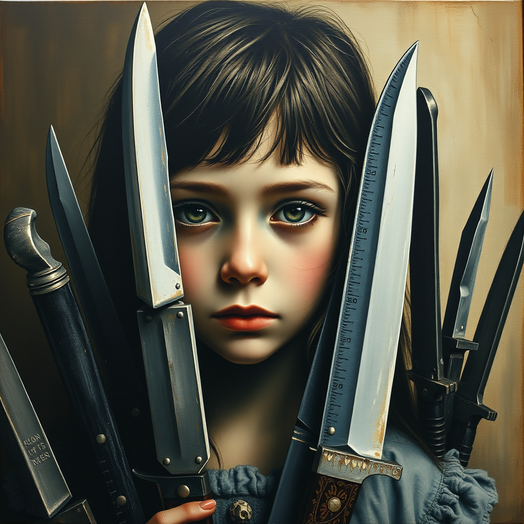 Portrait of a young girl with vacant eyes and a haunting gaze, surrounded by an array of knives, rendered in an artistic oil painting style reminiscent of Diego Velazquez. The texture is intentionally grainy and rough, capturing a raw essence. Canvas proportions elongated with a 9:16 aspect ratio, maintaining high quality with personalized touches, infused with a bold stylization that pushes the boundaries of traditional portraiture.