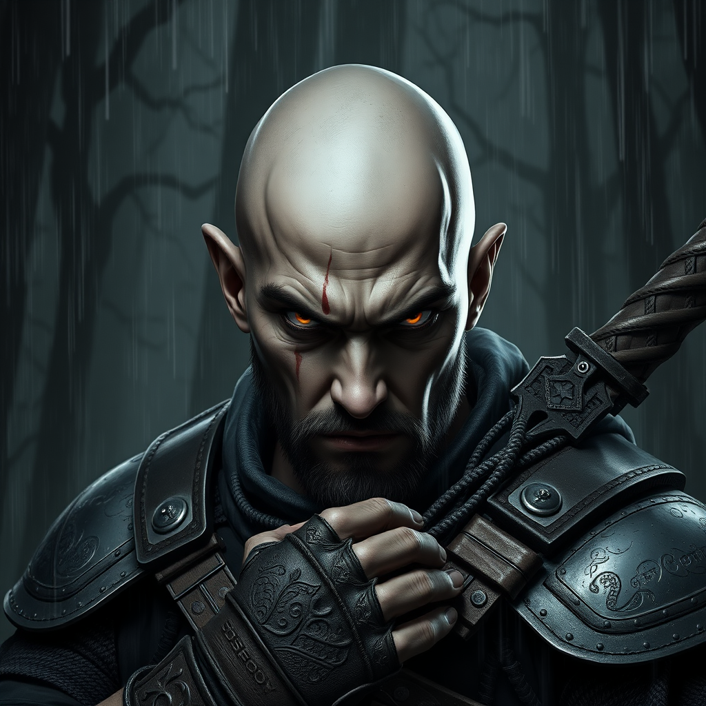 Portrait of a young, grizzled ranger with a piercing cold stare, clad in rugged armor. The man is bald, exuding anger and grim determination. The scene is set against a dark, forested backdrop filled with dynamic shadows and minimal light, creating a sense of mystery. His pose is dynamic and action-oriented, with every detail from his realistic hands to his facial features captured in sharp focus. The setting is enriched with a majestic, cluttered environment, embodying a fantastic locale. Rendered in full-body 8k clarity, the image displays the stark contrast of heavy rain and floating particles, delivering a dramatic atmosphere. The digital artwork boasts smooth lines and intricate details, reminiscent of the styles of Artgerm, Wlop, Ilya Kuvshinov, Greg Rutkowski, and echoes the elegance of Alphonse Mucha. A subtle two-tone lighting highlights faint facial markings, adding depth to his expression. Dark, decadent tones dominate the art, while a haze envelops the periphery, maintaining a monochrome aesthetic without compromising clarity.
