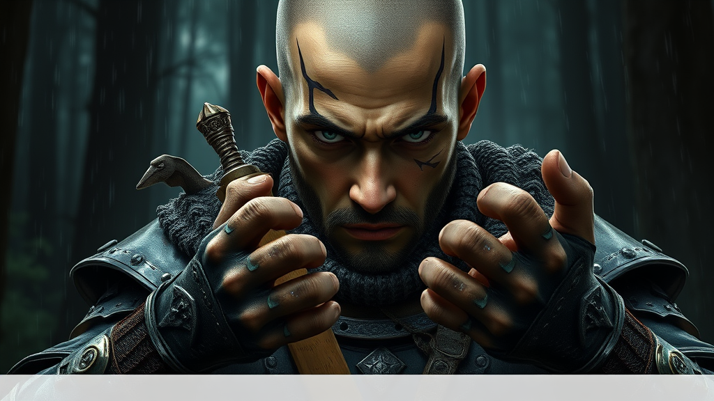 Portrait of a young ranger man with a piercing gaze, wearing rugged armor, grizzled, bald, with an intense expression. The setting is a dense forest with dark, muted colors, conveying a grim atmosphere. The scene is highly detailed, showcasing realistic hands in a dynamic pose, and it's set against a fantastical, majestic environment. Rendered in 8k for stunning clarity, it captures an action shot with noticeable skin pores, under very dark lighting with heavy shadows. The detailed face is expressive and intricate, embracing a digital painting style reminiscent of ArtGerm, WLOP, Ilya Kuvshinov, Greg Rutkowski, and Alphonse Mucha. The scene evokes a sense of drama with heavy rain, floating particles, and dim, moody lighting. The ranger's gear is accented with subtle floral motifs and unique facial markings, adding to his mysterious aura. The ranger's outfit includes modern elements like blue jeans, blending tradition with contemporary influences. The artwork is seamless and in sharp focus, avoiding anatomical errors and maintaining professional quality, akin to works found on ArtStation.