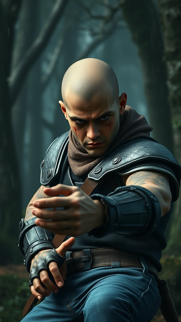 Portrait of a young ranger with a cold stare, wearing armor, grizzled, bald, angry, and grim. Dark colors dominate the forest background. A sharp, highly detailed figure in a dynamic pose, set within a fantastical, majestic, and cluttered environment. The scene is captured in an 8k unity render, showcasing an action shot with realistic hands, detailed skin pores, and a sharply focused, detailed face. The digital painting draws inspiration from artists like Artgerm, WLOP, Ilya Kuvshinov, Greg Rutkowski, and Alphonse Mucha. Heavy rain and floating particles add texture to the dimly lit, two-tone lighting. The ranger wears blue jeans, with facial markings and flowers accenting the scene. The render's quality is flawless, with no imperfections such as extra limbs or deformities. The scene is detailed in a smooth, sharp focus, blending a monochrome and decadent aesthetic.