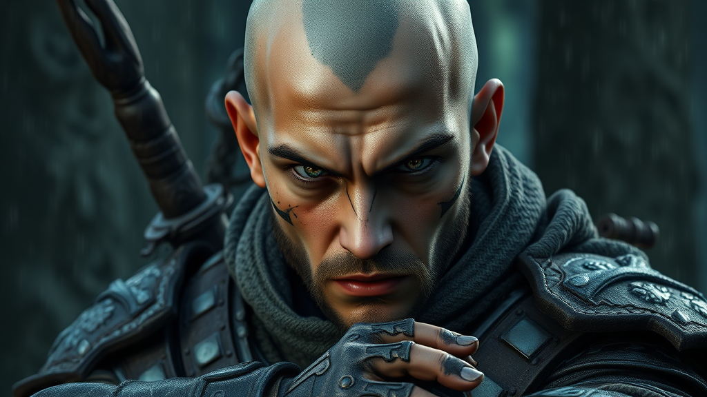 Portrait of a young ranger with an intense gaze, clad in rugged armor, bald with a grizzled, angry expression. Set against a dark forest backdrop, featuring sharp, highly detailed concept art, realistic hands, captured in a dynamic pose within a fantastic, cluttered environment. Showcased in a full-body 8k unity render, the action shot highlights skin pores in very dark lighting, with heavy shadows emphasizing a detailed, grim face. The composition, inspired by artists such as Artgerm, wlop, Ilya Kuvshinov, Greg Rutkowski, and Alphonse Mucha, features heavy rain and floating particles in dim, trim, two-tone lighting. Subtle facial markings appear alongside a hint of floral detail, blending a touch of fantasy with realism.