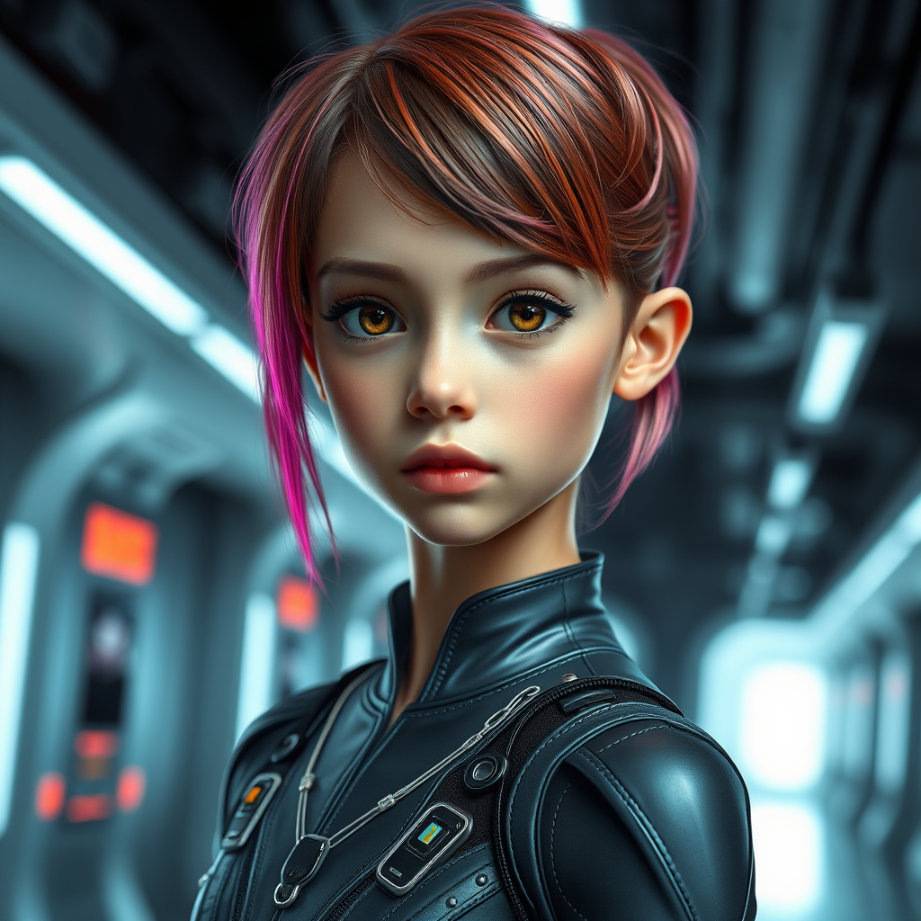 Portrait of a young slender girl with expressive and deep eyes, an innocent and naive expression, showcasing stunning beauty with a chic haircut and vibrant hair color, clothed in a sleek, tight-fitting jumpsuit made of sophisticated science fiction material adorned with futuristic elements. She stands in the midst of a captivating sci-fi room, depicted in ultra-high resolution, photorealistic detail enhanced by Rembrandt lighting. The focus remains on the elegance and grace, eliminating unrealistic or distorted features to emphasize her natural, radiant allure.