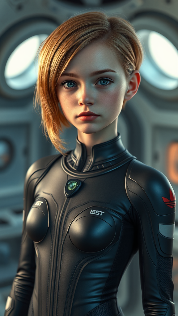 Portrait of a young, slender girl with expressive, deep eyes and a stunning face, capturing a naive and innocent expression, exuding stunning beauty. She has a chic, modern haircut and her hair color contrasts beautifully with a tight-fitting jumpsuit made of advanced science fiction material, adorned with futuristic elements. She stands against the backdrop of a futuristic, ultra-high-resolution science fiction room, with a photorealistic, hyperrealistic quality and the rich illumination reminiscent of Rembrandt lighting. The image avoids any deformities, ensuring perfect anatomy and proportions, with impeccable detailing in every aspect, from her hands to her gaze, emphasizing her elegance without any imperfections or distortions. The setting is enhanced by natural, ambient lighting with round windows adding to the sci-fi atmosphere, maintaining a harmonious and captivating visual experience.