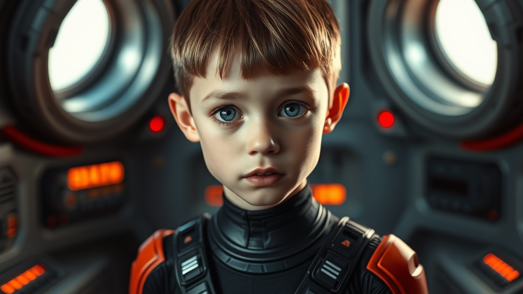 Portrait of a young, stunningly beautiful girl with expressive, deep eyes set against a science fiction backdrop, featuring a naive and innocent expression. Her slender frame is accentuated by a tight-fitting jumpsuit made of advanced sci-fi material, adorned with futuristic elements. Her cheggie haircut frames her face, enhancing her striking features. The setting is a high-tech sci-fi room, capturing intricate details in ultra-high resolution, resembling a hyperrealistic painting with exceptional lighting akin to Rembrandt's style. The fascinating environment includes round windows and subtle natural light that complements her captivating presence. A serene and ethereal ambiance envelops the scene, emphasizing her beauty and the advanced era she inhabits.