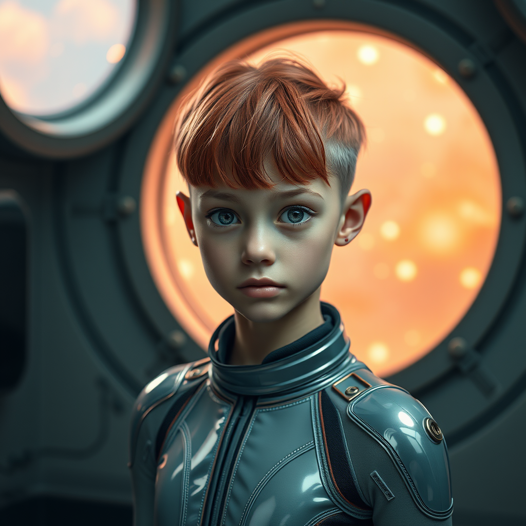 Portrait of a young, stunningly beautiful, slender girl with deep, expressive eyes and a naive, innocent expression. She has a chic haircut and vibrant hair color and is dressed in a tight-fitting jumpsuit crafted from the finest science fiction materials with futuristic elements. She stands in a sci-fi-inspired room, captured with stunning quality, ultra-high resolution, photorealism, and 8k detail, using Rembrandt lighting. Despite the focus on perfection, subtle creative distortions hint at an alternate reality: slightly elongated limbs, ethereal reflections, and an intriguing, dreamlike atmosphere. Transcending ordinary beauty, she exudes both innocence and otherworldly allure amidst a backdrop of round, cosmic windows, adding to the surreal, immersive experience.