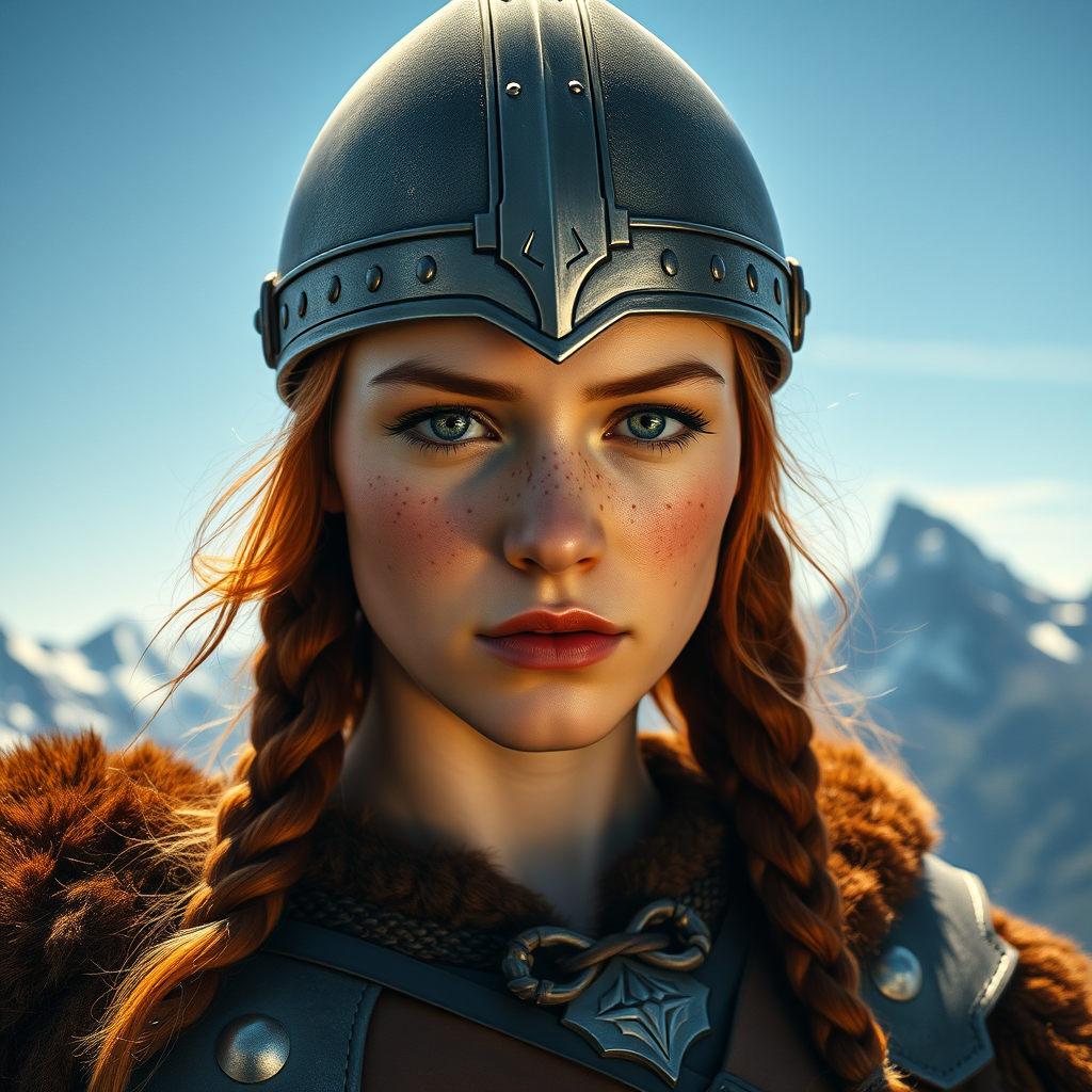 Portrait of a young Viking woman with fiery red hair and a constellation of freckles across her cheeks, her eyes vivid and expressive with intricate detail. She is clad in authentic Viking armor, standing proudly under a bright sun. Her helmet gleams in the light, casting dynamic shadows across her face, enhancing her fierce expression. In the background, majestic mountains tower against a clear blue sky, adding an epic scale to the scene. The cinematic atmosphere is accentuated by dramatic, precise lighting that highlights the rich textures of her attire and the natural beauty around her. The overall image is a breathtaking blend of realism and mythical grandeur, with every detail meticulously crafted.