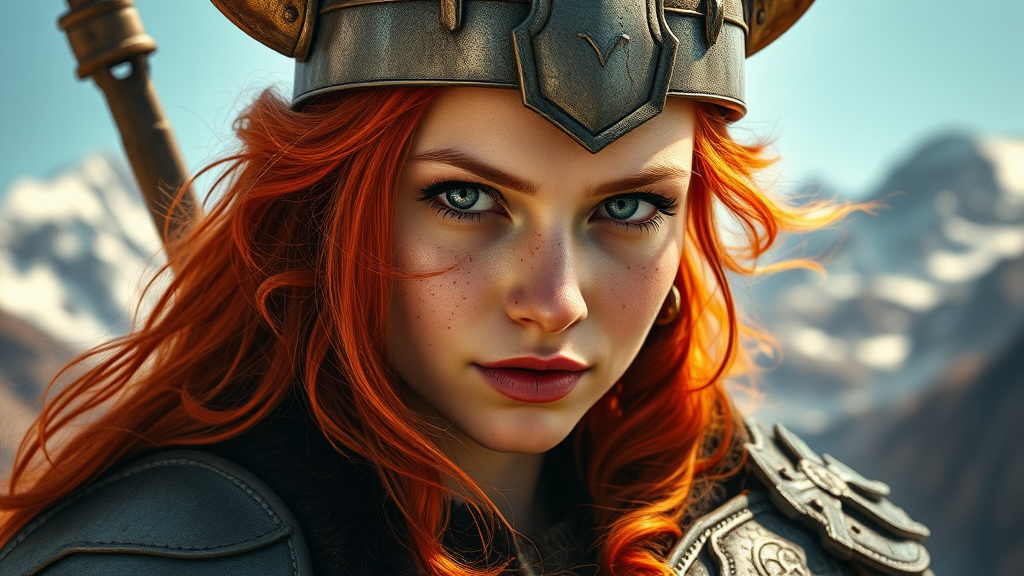 Portrait of a young woman as a fierce Viking, her vibrant red hair cascading over her shoulders, a sprinkle of freckles adorning her cheeks. Her eyes, intensely detailed, reflect both wisdom and determination. She is clad in intricately designed Viking armor, with a formidable helmet framing her face. It's a bright, sunny day, with a backdrop of majestic mountains that accentuate the cinematic quality of the scene. The light plays dramatically across her features, enhancing the realistic and epic feel of the portrait. The intricate details of her armor and the vibrant colors make the image strikingly lifelike, capturing the essence of strength and courage.
