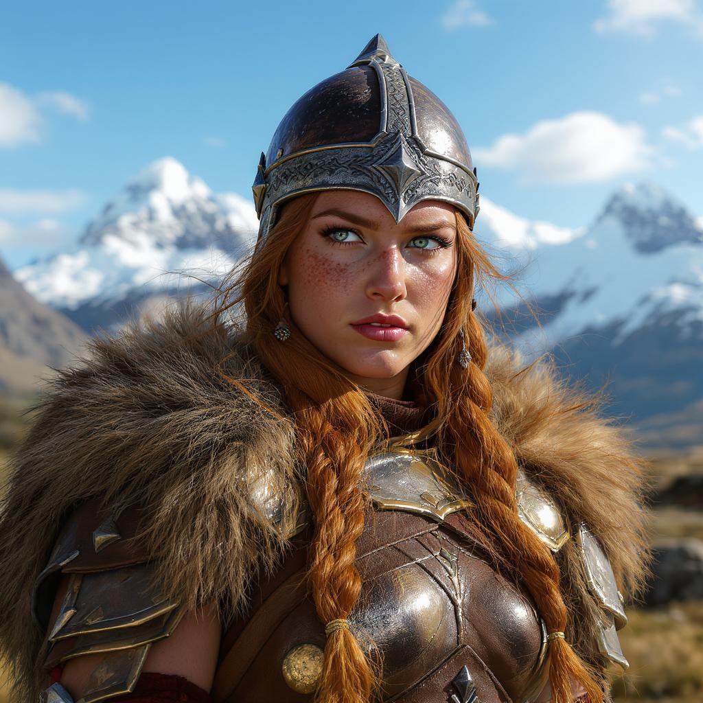Portrait of a young woman as a fierce Viking warrior, exuding strength and grace. Her cascading red hair, interwoven with braids, catches the sunlight, highlighting her freckles. Her piercing, detailed eyes are filled with determination and wisdom, hinting at countless adventures. She wears intricate Viking armor, perfectly crafted for both protection and mobility, with a storied Viking helmet adorned with traditional engravings resting confidently atop her head. The setting is a bright, clear day, the sun casting a warm glow. Behind her, majestic mountains rise against the horizon, enhancing the scene's grandeur. The portrait captures the essence of a cinematic, realistic masterpiece, with epic, dramatic lighting emphasizing every meticulous detail.