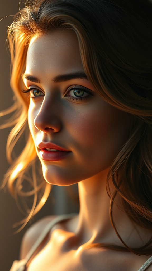 Portrait of a young woman, detailed artwork reminiscent of Joaquin Sorolla, bathing in gentle natural light, captured with an 85mm lens, golden sunshine casting a warm glow on her face, cinematic ambiance, shimmering reflections in her eyes, strikingly photorealistic environment, hyperrealism with subtle CGI enhancements, utilizing advanced octane render and raytracing for depth and detail.