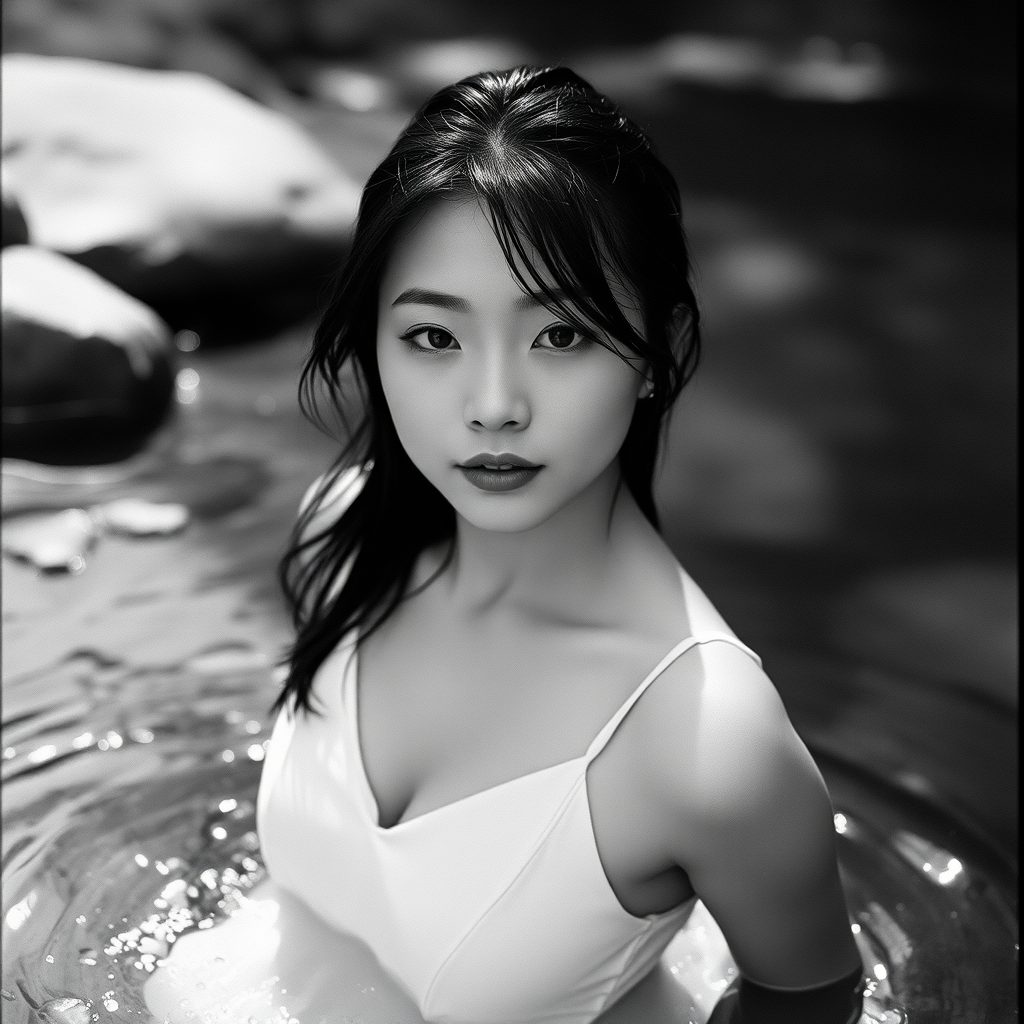 Portrait of a young woman emerging gracefully from the river, wearing a wet white dress, with her dark hair slicked back. Shot during daylight, capturing the essence of deep photography with Ilford HP5 film. A monochromatic image with crushed blacks, showcasing a rich depth of field and pronounced shadows. Film grain adds texture, while natural light highlights her form. A subtle watermark hints at artistic ownership. The composition hints at an ethereal feel, celebrating beauty with a touch of creative surrealism. Asian descent, with delicate features that convey emotion.