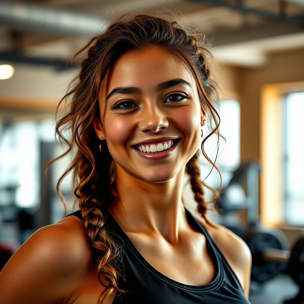 Portrait of a young woman in a gym setting, showing her dynamic and energetic aura, with a focus on natural expression and vibrant surroundings. The scene captures the essence of fitness and motivation, with an emphasis on clean, uncluttered background and avoidance of any logos, brands, or text elements.