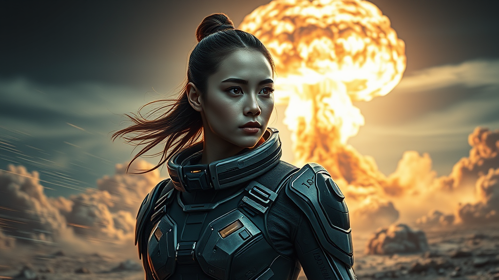 Portrait of a young woman in a sleek exo-suit, adorned with intricate sci-fi armor, set against the dramatic backdrop of a massive nuclear explosion. The scene captures the intense energy of the blast wave and swirling nuclear ash, with the iconic mushroom cloud looming in the distance. The image is rendered with maximum detail, embodying a futuristic and science fiction aesthetic in 8K UHD, emphasizing hyper-realism and photorealism. There's a palpable sense of speed and acceleration, heightened by a dynamic light flash that illuminates the scene. The composition feels like a meticulously crafted painting, seen from a third-person perspective, embracing a cinematic quality with complex lighting and thoughtful staging, reminiscent of a long exposure photograph.