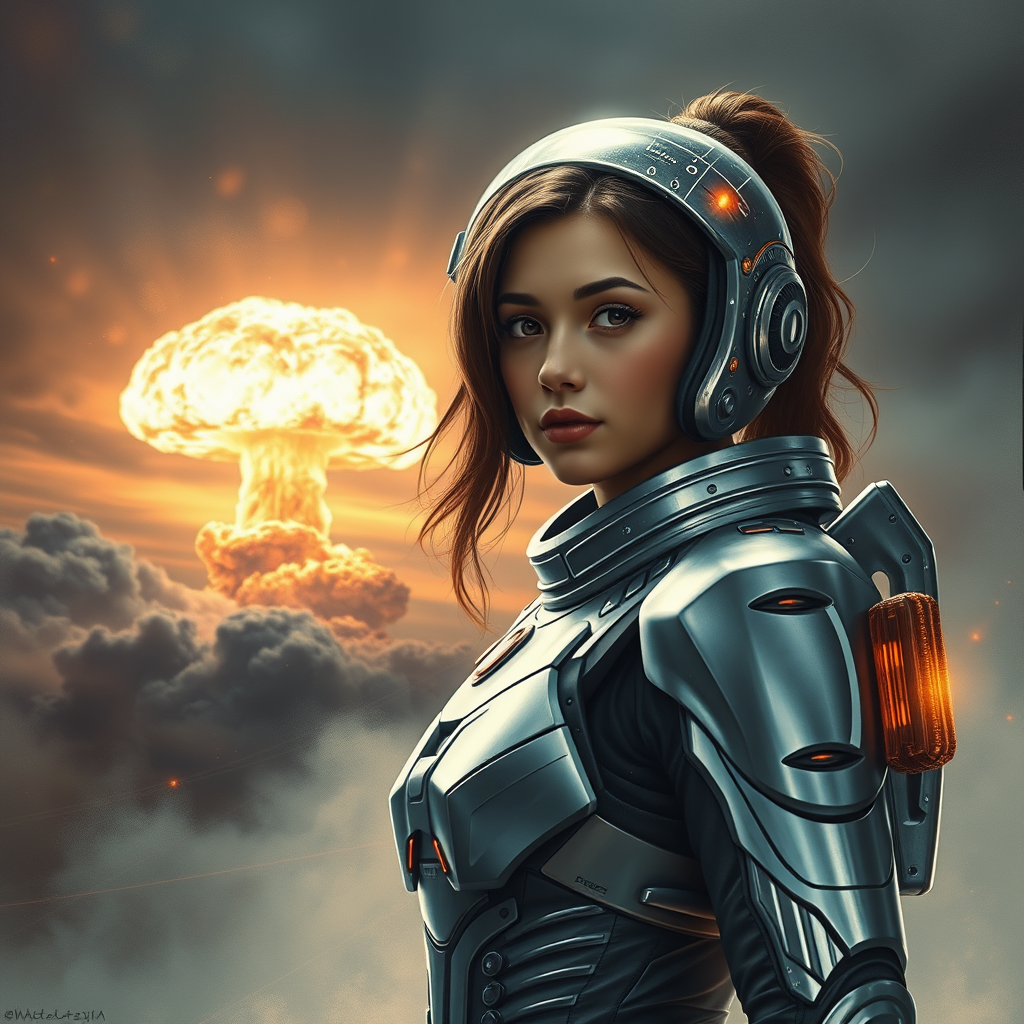 Portrait of a young woman in advanced exosuit, sleek sci-fi armor gleaming against a backdrop of a nuclear explosion, with the mushroom cloud towering in the distance. The scene captures the intensity of the blast wave and nuclear ash swirling around her. Incredibly detailed and futuristic, the imagery embodies the essence of science fiction with an 8K, UHD clarity. Hyper-realistic elements bring out the acceleration and dynamic flash of light, evoking a sensation of speed. The painting is viewed from a third-person perspective, capturing the subject in cinematic framing. Complex lighting and a long exposure effect enhance the scene, creating an immersive experience that combines photorealism with cinematic depth, presenting an epic and visually captivating narrative.