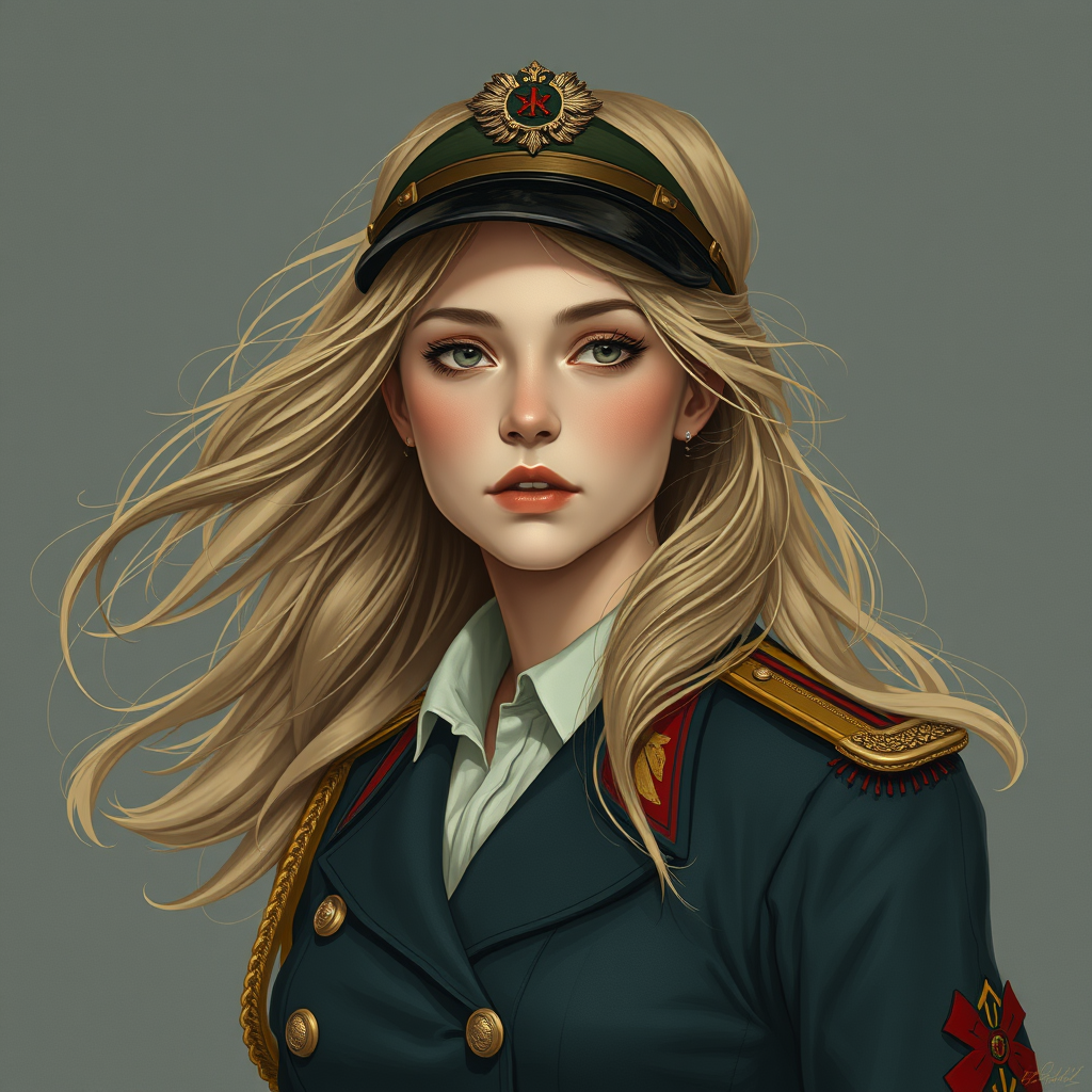 Portrait of a young woman in an officer's ceremonial tunic, with flowing blond hair, depicted in a full body dieselpunk style inspired by Ian McQue. Set within the British empire, the illustration is rich with intricate and vintage details, embodying a retro aesthetic. It features soothing tones and a hyper-detailed composition with soft, cinematic lighting, embracing a dim palette of colors. The atmosphere is slate gray, with an emphasis on a faded, low contrast look. The image is composed with a focus on detailed craftsmanship, without the inclusion of distortions or unnatural elements.