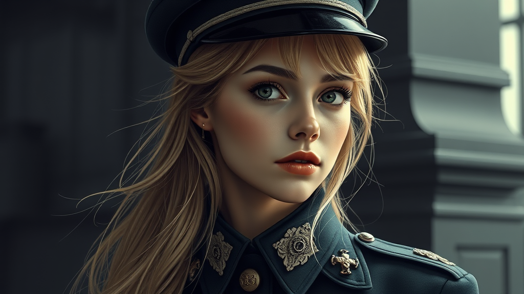 Portrait of a young woman in an officer's ceremonial tunic, with loose blond hair cascading down, depicted in a full body view. The setting is in a dieselpunk style reminiscent of Ian McQue, encapsulating the essence of a vintage British Empire aesthetic. The artwork showcases intricate and hyper-detailed illustrations with a subtly retro vibe, using soothing tones and soft cinematic lighting to create a low-contrast, slate gray atmosphere. The depiction is detailed yet subtly distorted, integrating faded elements and a dim color palette, all while maintaining a refined exposure blend. Despite the intentional imperfections and creative abstractions in anatomy to induce a sense of mutation and deformation, the illustration captivates with its unique charm and intricate details, fostering a world that feels both familiar and otherworldly.