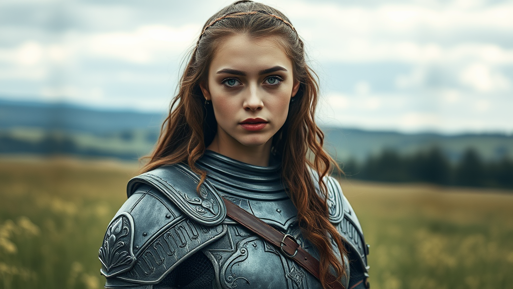 Portrait of a young woman wearing intricate medieval armor, delicate metal glints highlighting the craftsmanship, depicted from the waist up, set against a sprawling outdoor meadow, an overcast sky casting a soft, moody light, sharply focused details capturing the essence of her expression, enhanced by natural cinematic ambiance, rendered with hyper-realistic quality, evoking a dreamlike, immersive atmosphere.