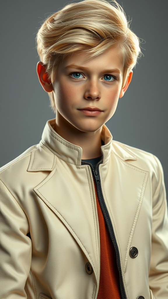 Portrait of a youthful Fred from Scooby Doo, dressed in a sleek ivory jacket, his blonde hair impeccably styled, exuding strength and confidence; the composition features a strong, sharp focus with an emphasis on digital artistry. This single subject piece is conceptual in nature, enhanced through post-processing with striking, dynamic lighting that highlights every ultra-detailed aspect, resulting in a high-quality render that captures both the essence and vibrancy of the character with subtle, creative nuances.